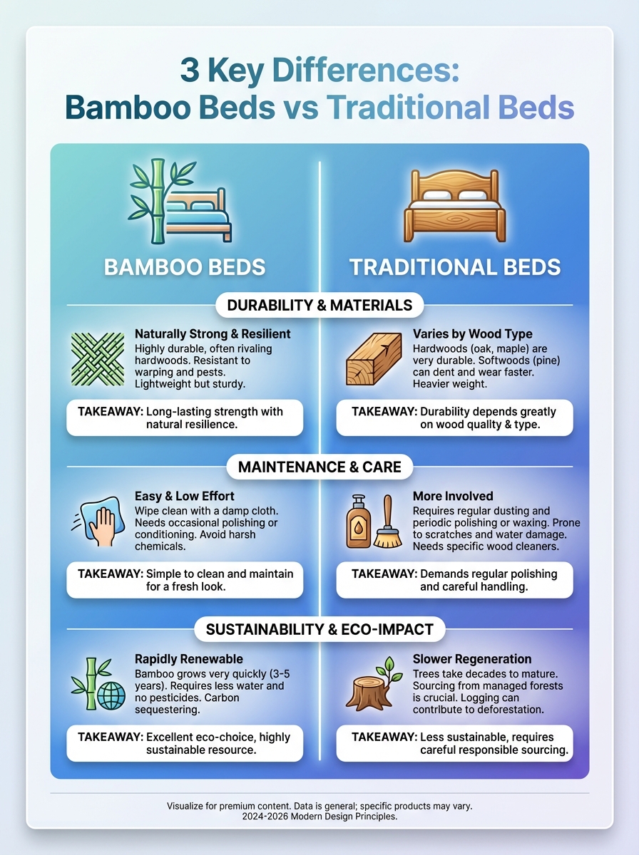 Infographic showing Bamboo Beds vs Traditional Beds with 3 key differences in sustainability, durability, and price.